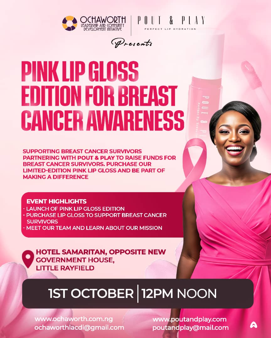 At Hotel Samaritan, Pout and Play, led by the visionary Sheilz, in partnership with the Ochaworth Leadership and Community Development Initiative (OWLACDI) under the capable leadership of Dirmicit Pyentam, will unveil the Limited-Edition Pink Lip Gloss Collection. This launch is not about glamour alone; it is about hope, strength, and solidarity in the fight against breast cancer. Every tube sold becomes a contribution to awareness, treatment, and advocacy for countless women.