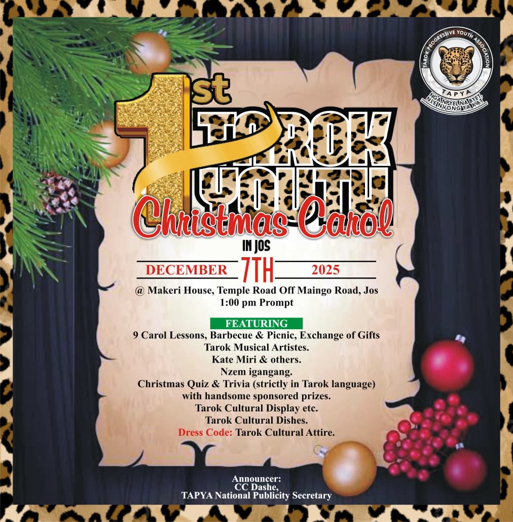 The Tarok Progressive Youth Association (TAPYA), the global umbrella body for Tarok youth, is set to host the First Tarok Christmas Carol in Jos, promising a historic celebration of faith, culture, and Tarok identity. The event will hold on Sunday, 7th December 2025, from 1:00 pm.