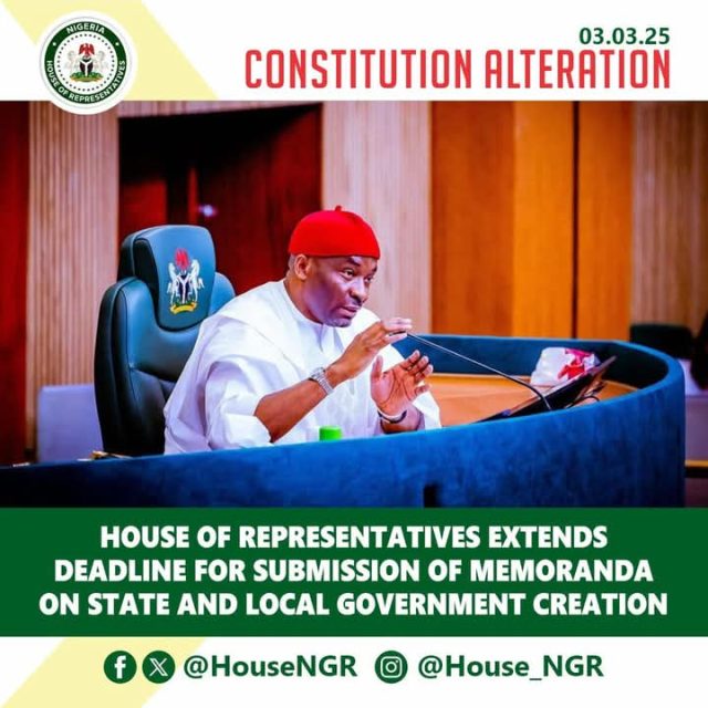 The House of Representatives, through its Committee on the Review of the Constitution of the Federal Republic of Nigeria, 1999 (As Amended), has extended the deadline for the submission of memoranda on the creation of new states and local governments in response to public demand.