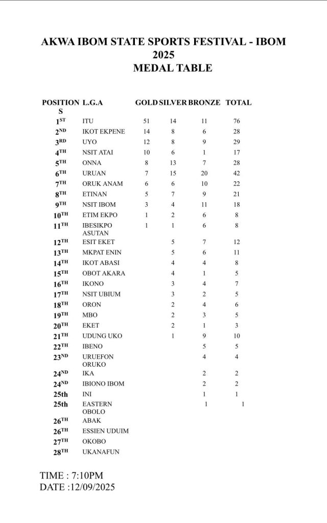 The closing ceremony featured cultural displays, musical performances, and the presentation of trophies to winning contingents, with Itu Local Government Area emerging overall champions of the festival, followed by Ikot Ekpene and Uyo as silver and bronze winners. Ukanafun, Okobo, Essien Udum and Abak Local Government returned home without a single medal
