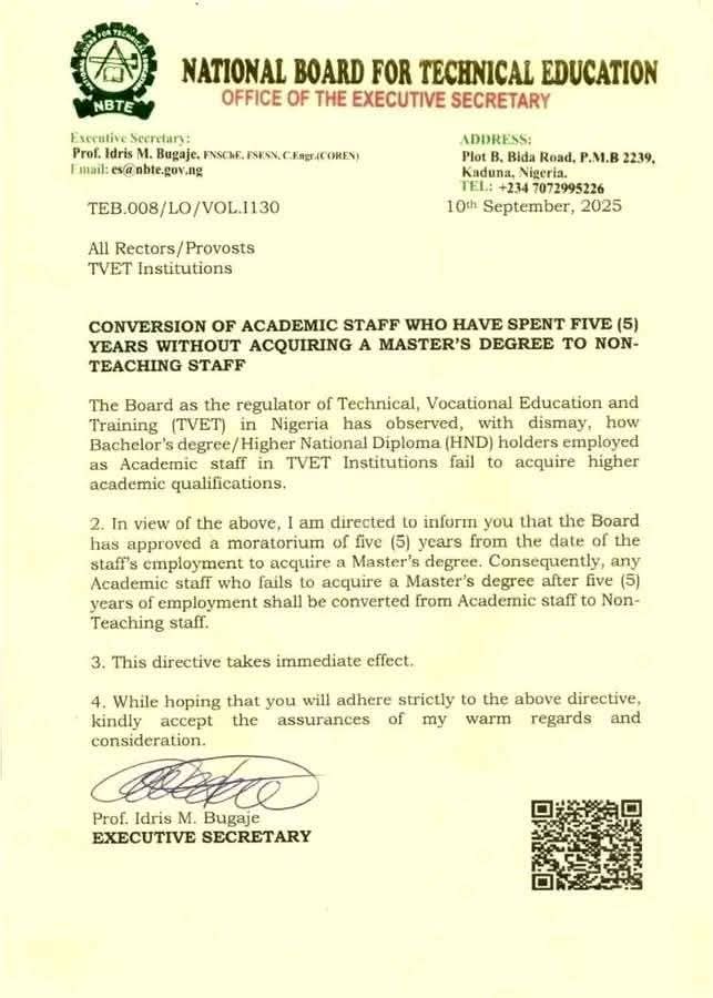 The National Board for Technical Education (NBTE) has issued a new directive mandating the conversion of all Polytechnic staff with only a first degree or Higher National Diploma (HND), but without a Master’s degree, from academic to non-academic positions after five years of employment.