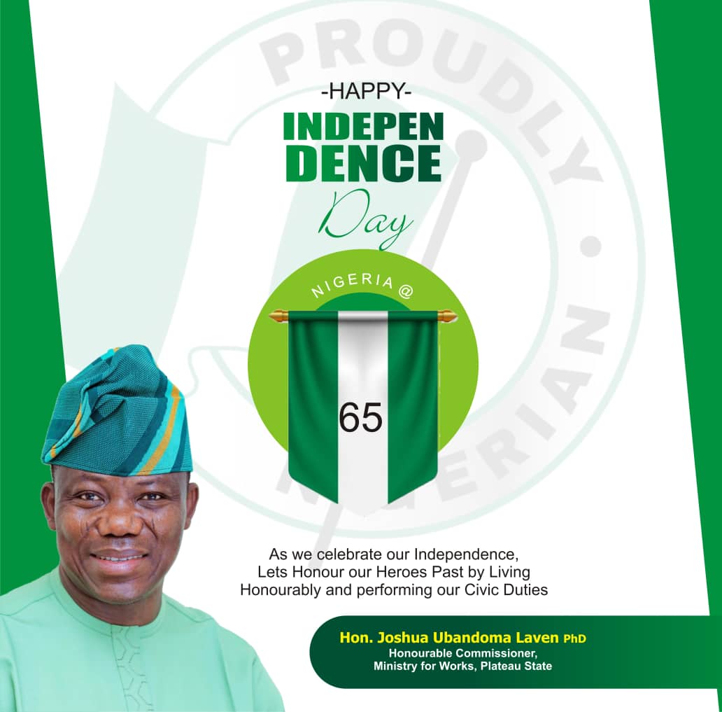 Jos, October 1, 2025 – As Nigeria marks her 65th Independence Anniversary, the Plateau State Commissioner for Works, Hon. Joshua Ubandoma Laven, Ph.D., has joined millions of Nigerians in celebrating the nation’s enduring spirit of freedom, unity, and progress.