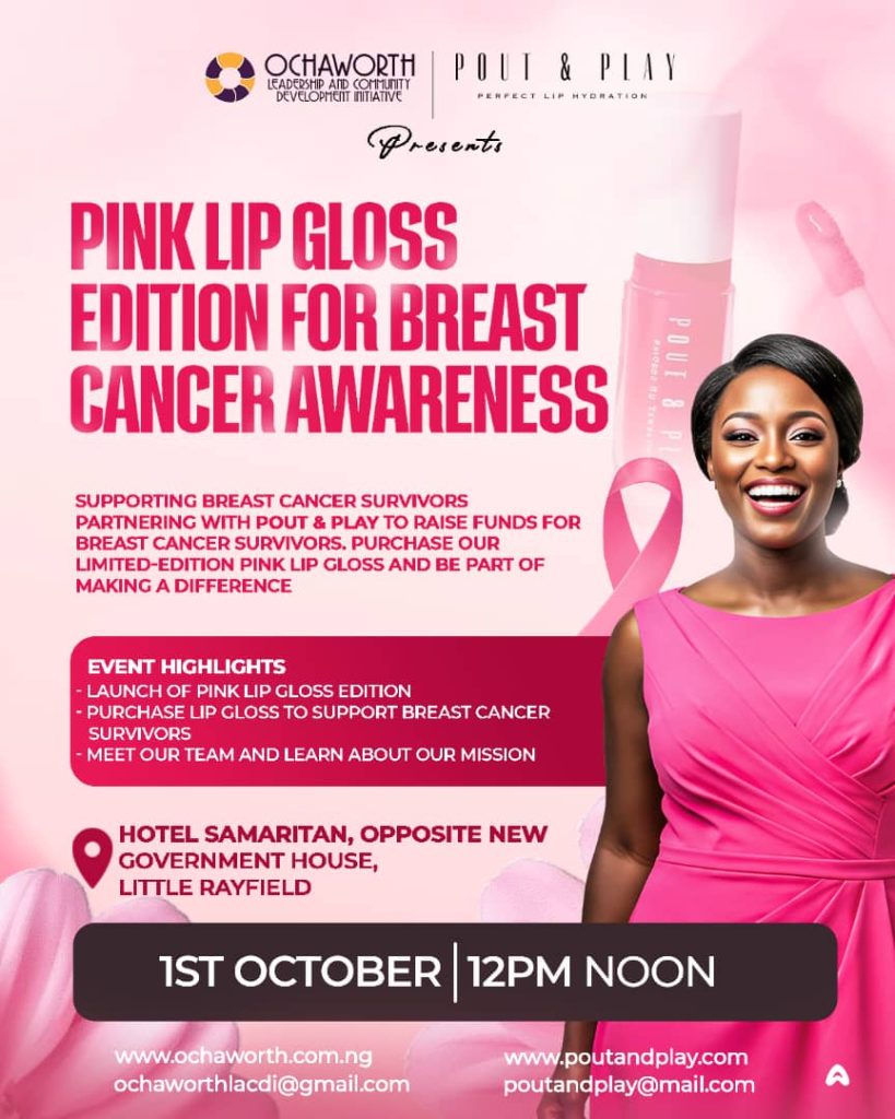 The initiative, themed “Pink Gloss for a Cause,” is set to be unveiled on October 1st at Hotel Samaritan, opposite New Government House, Little Rayfield, Jos by 12 noon. The launch will feature a limited-edition pink lip gloss collection dedicated to raising funds and awareness for breast cancer patients and survivors.