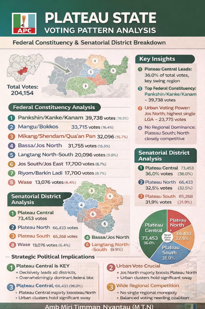 Statistically, Plateau Central enters the race with an edge. Politically, however, the near-equal distribution across the three senatorial districts means coalition-building and strategic mobilization will be decisive.
