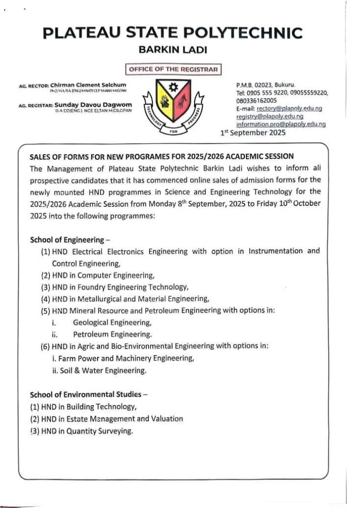 Plateau State Polytechnic Barkin Ladi has continued to attain new heights and broaden the educational scope of the institution. The state-owned populous institution under the pragmatic leadership of Dr Clement Selchum Chirman has on 1st September, 2025 announced the commencement of 20 new Higher National Programs. This comes as a delight to many citizens who hitherto have resorted to furthering their education in the neighbouring institutions like Federal Polytechnic Bauchi and Lafia