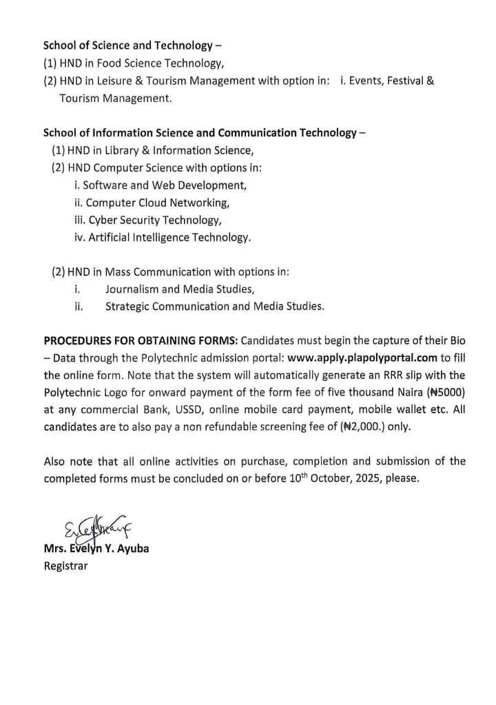 The Registrar, Mrs Ayuba advised candidates to “begin the capture of their Data through the Polytechnic admission portal: www.apply.plapolyportal.com to fill the online form. The form costs #5000 while a non refundable screening fee of #2000 only applies.