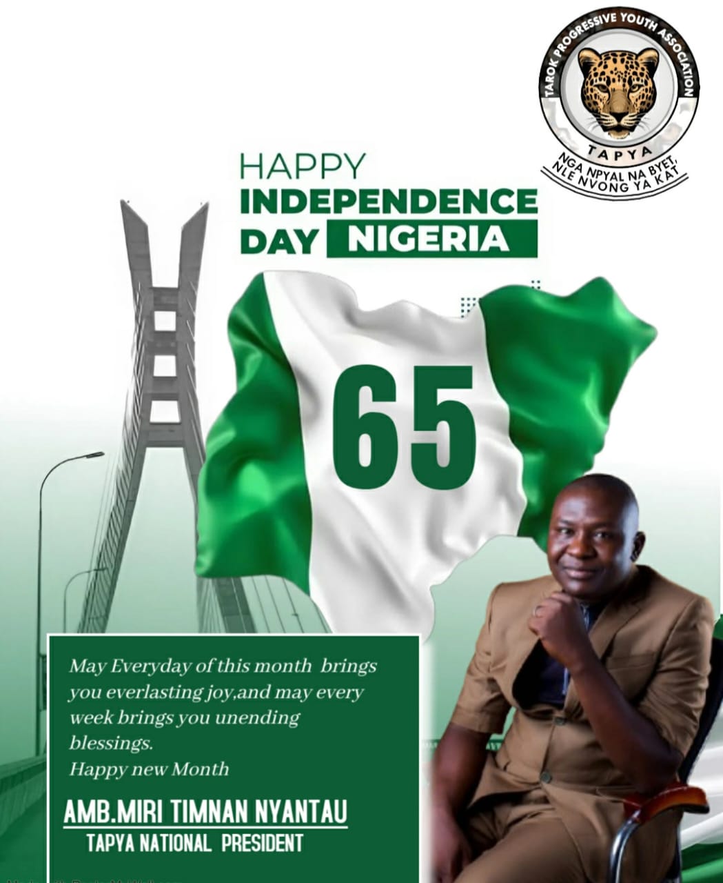 Jos, October 1, 2025 – The Tarok Progressive Youth Association (TAPYA) has joined the nation in celebrating Nigeria’s 65th Independence Anniversary, with its National President, Amb. Miri Timnan Nyantau (M.T.N), citing the bravery, achievements, and unity of the Tarok people.